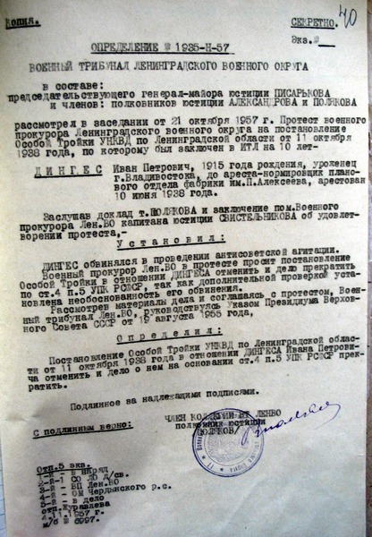 А тройка эта была: опер. Уполномоченный Юшков, нач. Шлиссельбургского ГО НКВД мл. лейтенант госбезопасности Творилов и нач. Леноперсектора УНКВД ЛО лейт. Госбезопасности Кондратович. Дингес Иван Петрович был осужден тройкой УНКВД ЛО сроком на 10 лет НТЛ. В ноябре 1940 года Ваня подал жалобу, которую в порядке надзора рассмотрел прокурор отдела по спецделам Якубенко. Решение было принято такое: жалобу осужденного Дингес оставить без удовлетворения, о чем поставить его в известность. Ваня отбыл 10 лет за колючей проволокой. В сентябре 1957 года в прокуратуру Союза ССР была подана жалоба с просьбой пересмотреть приговор, вынесенный особой тройкой в 1938 году, отменить таковой как не объективный и исскуственно созданный на порочном следственном материале. И опять тройка: (генерал-майор, и два подполковника):