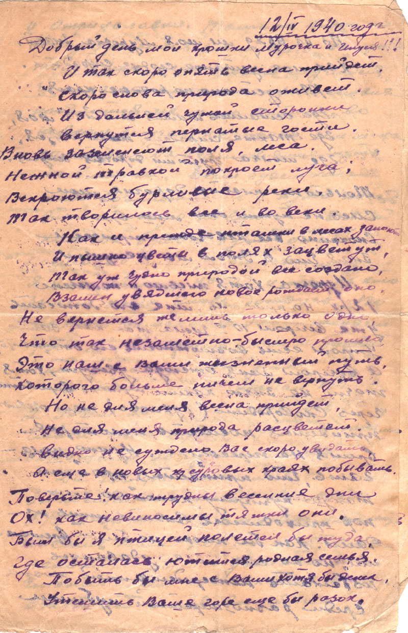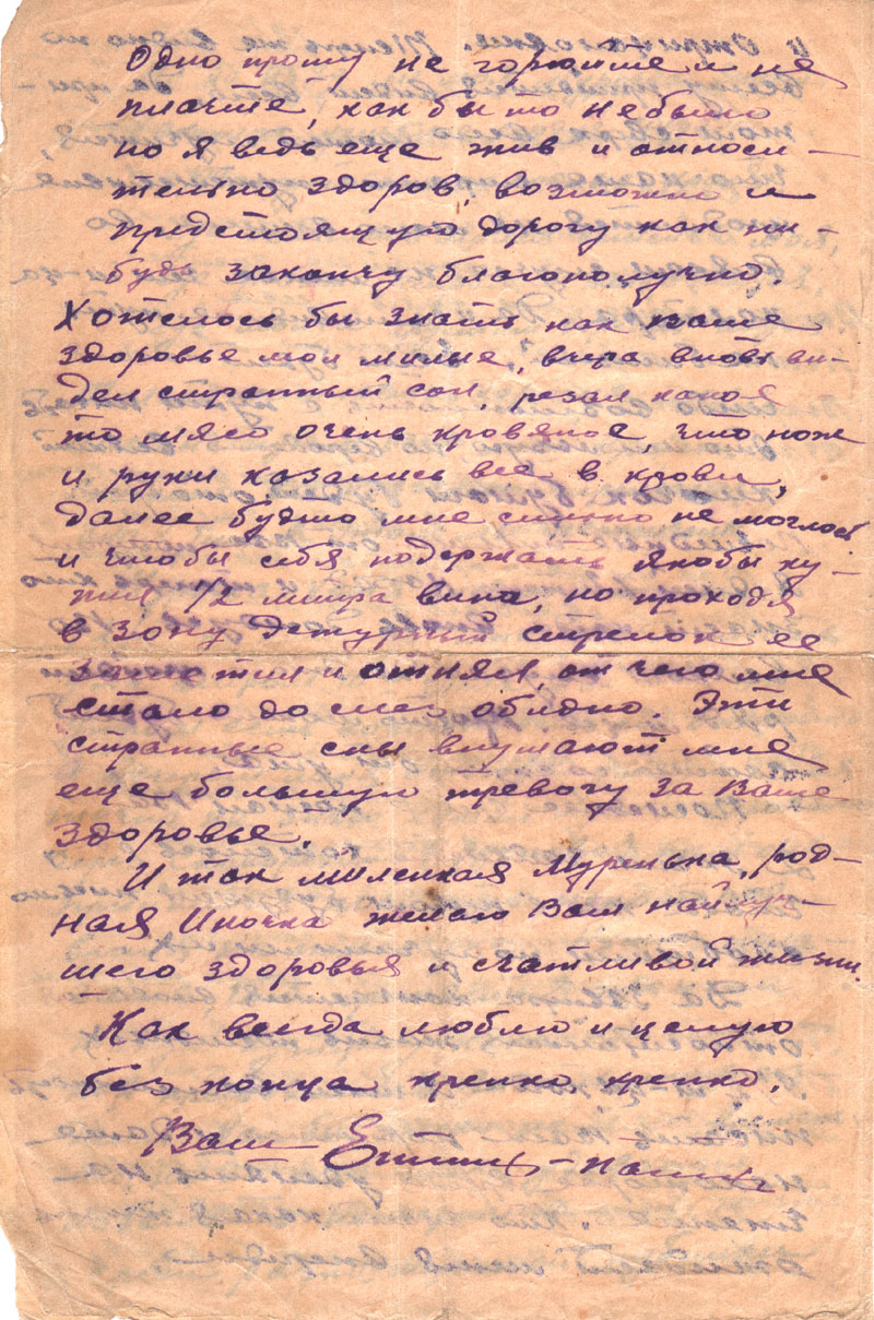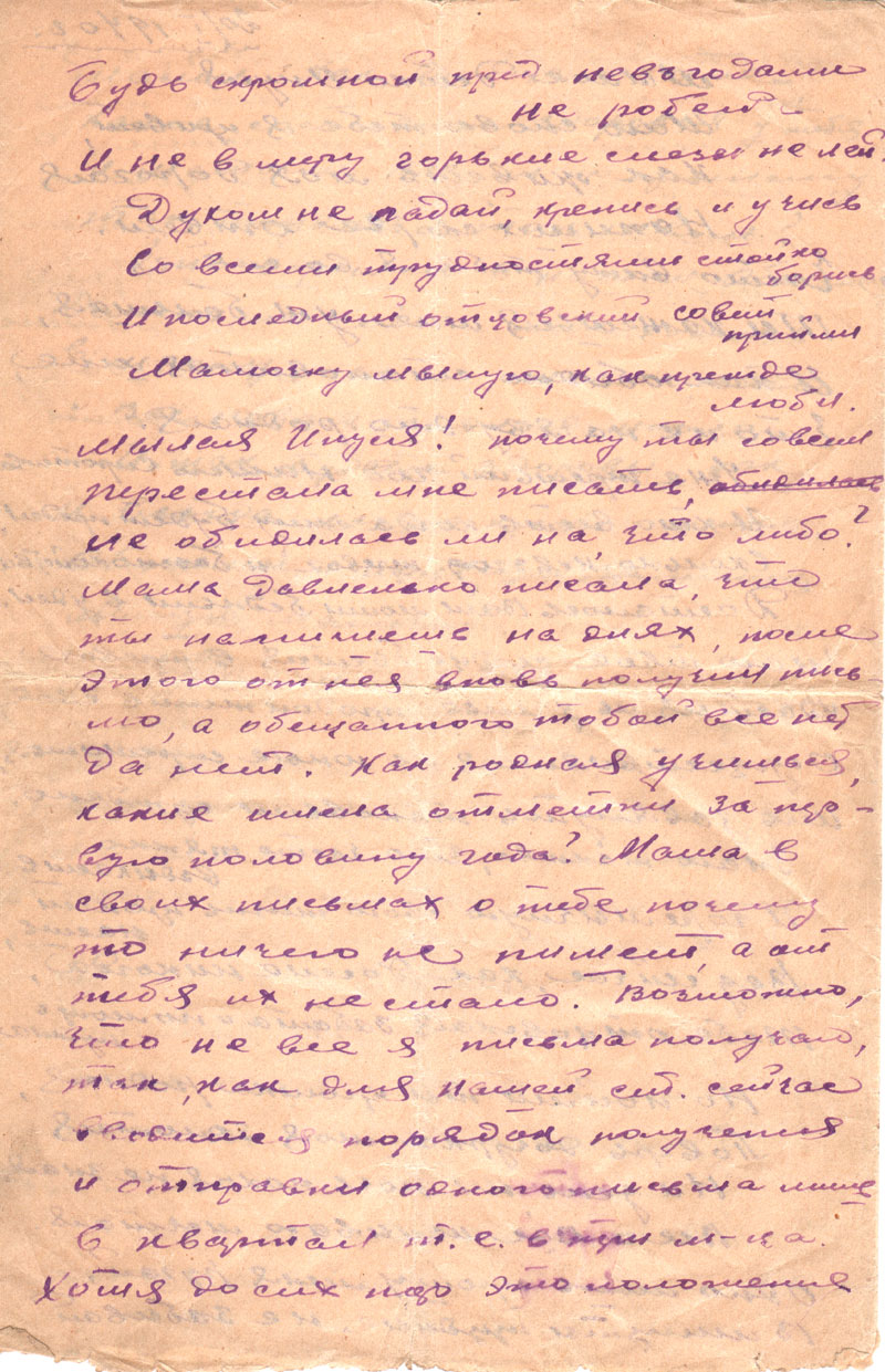 Как, родная, учишься, какие имела отметки за первую половину года? Мама в своих письмах о тебе почему-то ничего не пишет, а от тебя их не стало. Возможно, что не все я письма получаю, так как для нашей ст. сейчас вводится порядок получения и отправки одного письма лишь в квартал, т.е. в три месяца. Хотя до сих пор это положение, очевидно, не применяется, и я по-прежнему буду писать при малейшей возможности, о чем и Вас прошу.