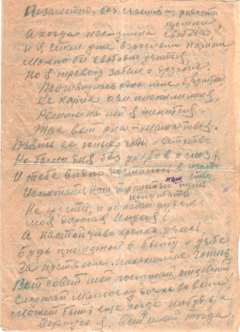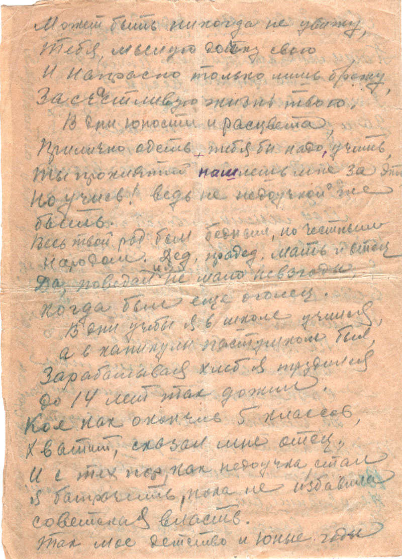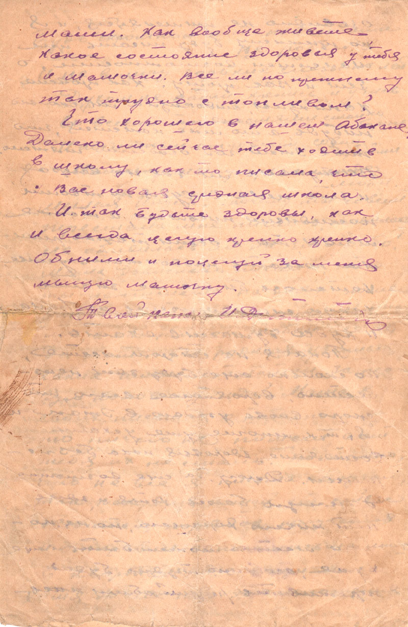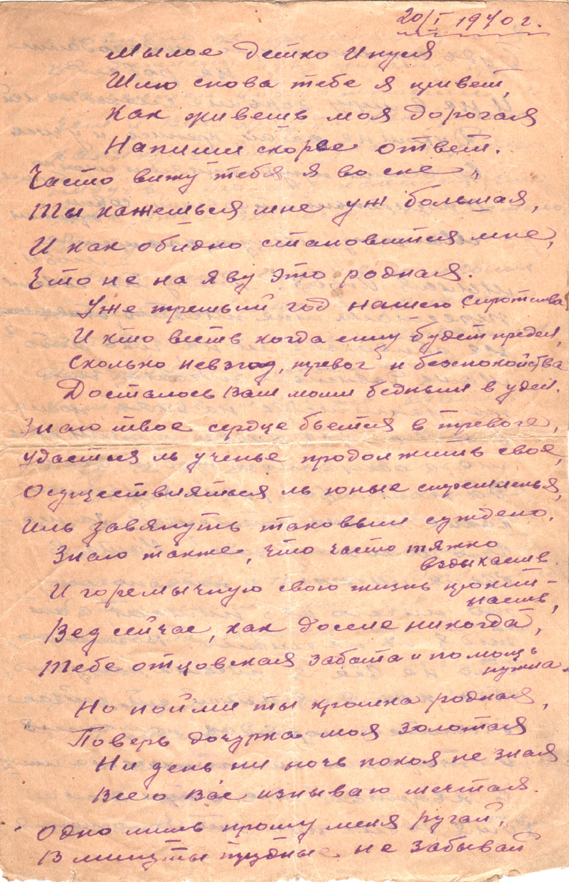 Как, родная, учишься, какие имела отметки за первую половину года? Мама в своих письмах о тебе почему-то ничего не пишет, а от тебя их не стало. Возможно, что не все я письма получаю, так как для нашей ст. сейчас вводится порядок получения и отправки одного письма лишь в квартал, т.е. в три месяца. Хотя до сих пор это положение, очевидно, не применяется, и я по-прежнему буду писать при малейшей возможности, о чем и Вас прошу.