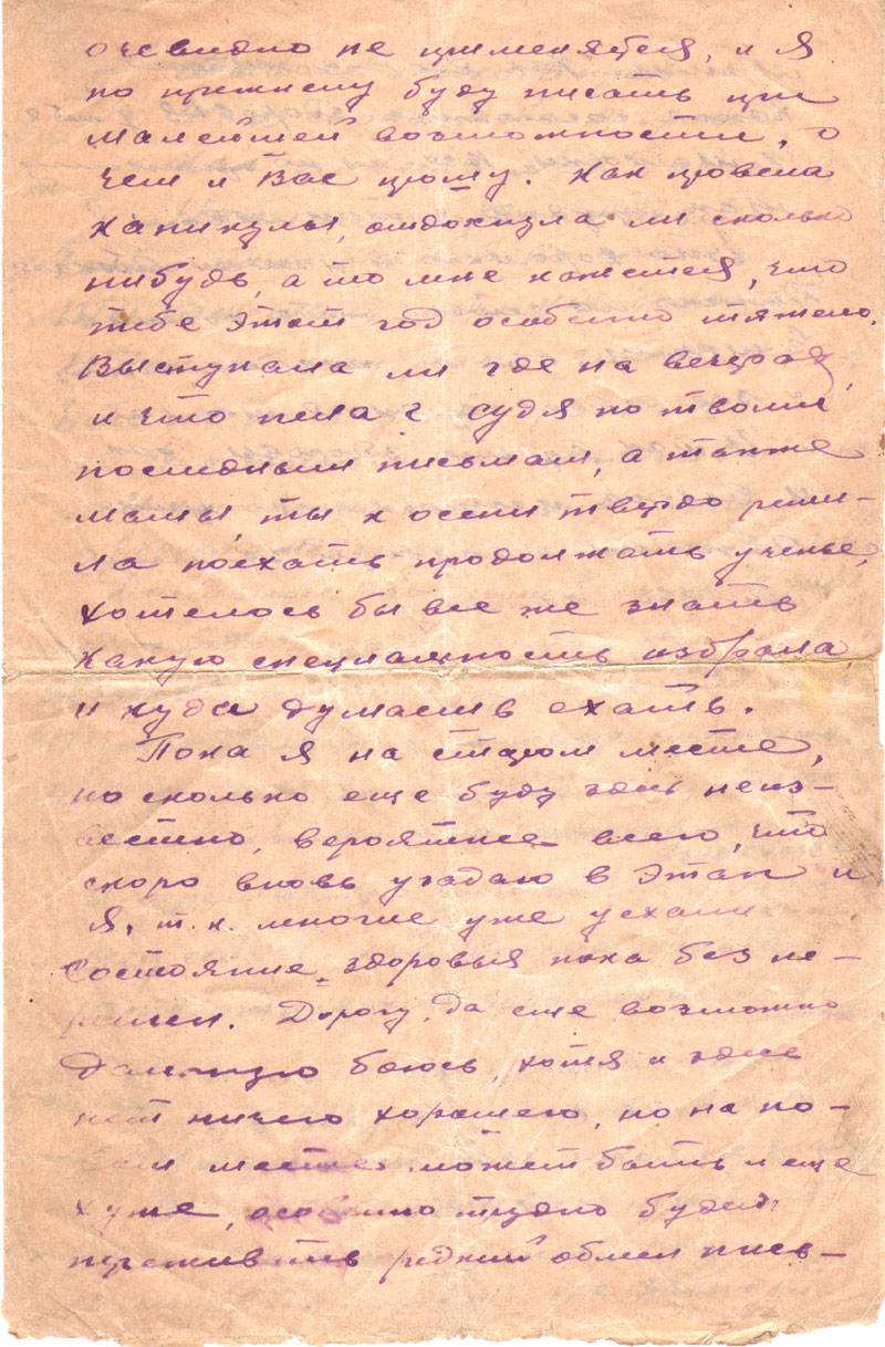 Как провела каникулы, отдохнула ли сколько-нибудь, а то мне кажется, что тебе в этот год особенно тяжело. Выступала ли где на вечерах и что пела? Судя по твоим последним письмам, а также мамы, ты к осени твердо решила поехать продолжать ученье, хотелось бы все же знать какую специальность избрала и куда думаешь ехать.