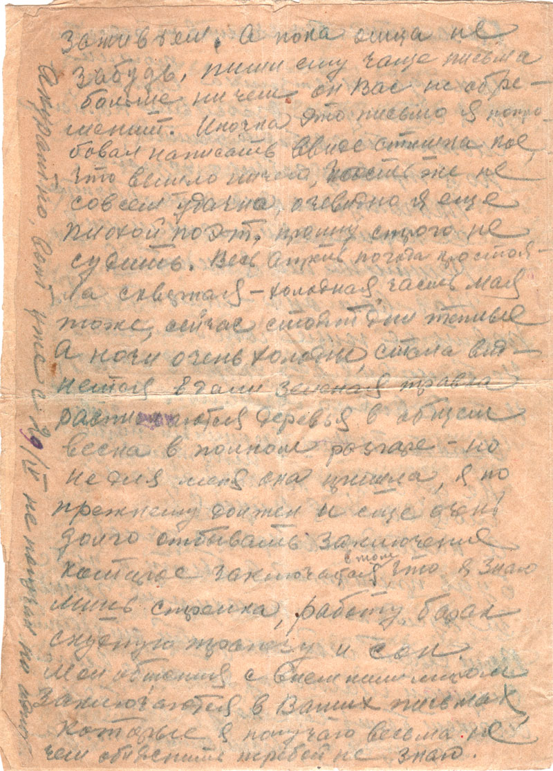 Весь апрель погода простояла скверная – холодная, часть мая тоже. Сейчас же стоят дни теплые, а ночи очень холодные. Стала виднеться вдали зеленая травка, распускаются деревья, в общем, весна в полном разгаре – но не для меня она пришла. Я по-прежнему должен и еще очень долго отбывать заключение, которое заключается в том, что я знаю лишь стройку, работу, барак, скудную трапезу и сон. Мои общения с внешним миром заключаются в Ваших письмах, которые я получаю весьма неаккуратно, не знаю чем объяснить перебой, вот уже с 29/IY не получил ни одного.