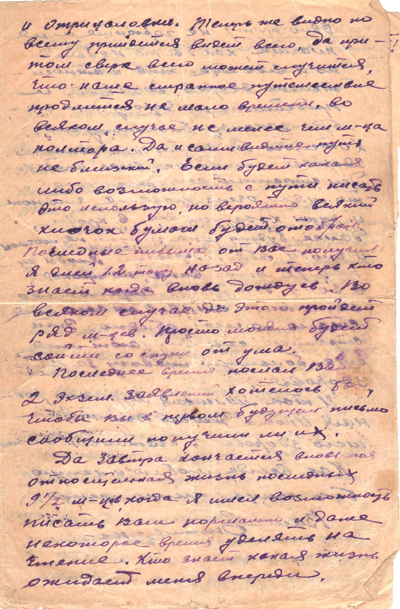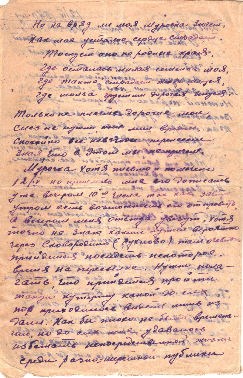 Состояние здоровья пока без перемен. Дорогу, да еще возможно дальнюю, боюсь, хотя и здесь нет ничего хорошего, но на новом месте может быть и еще хуже, особенно трудно будет переживать редкий обмен письмами.