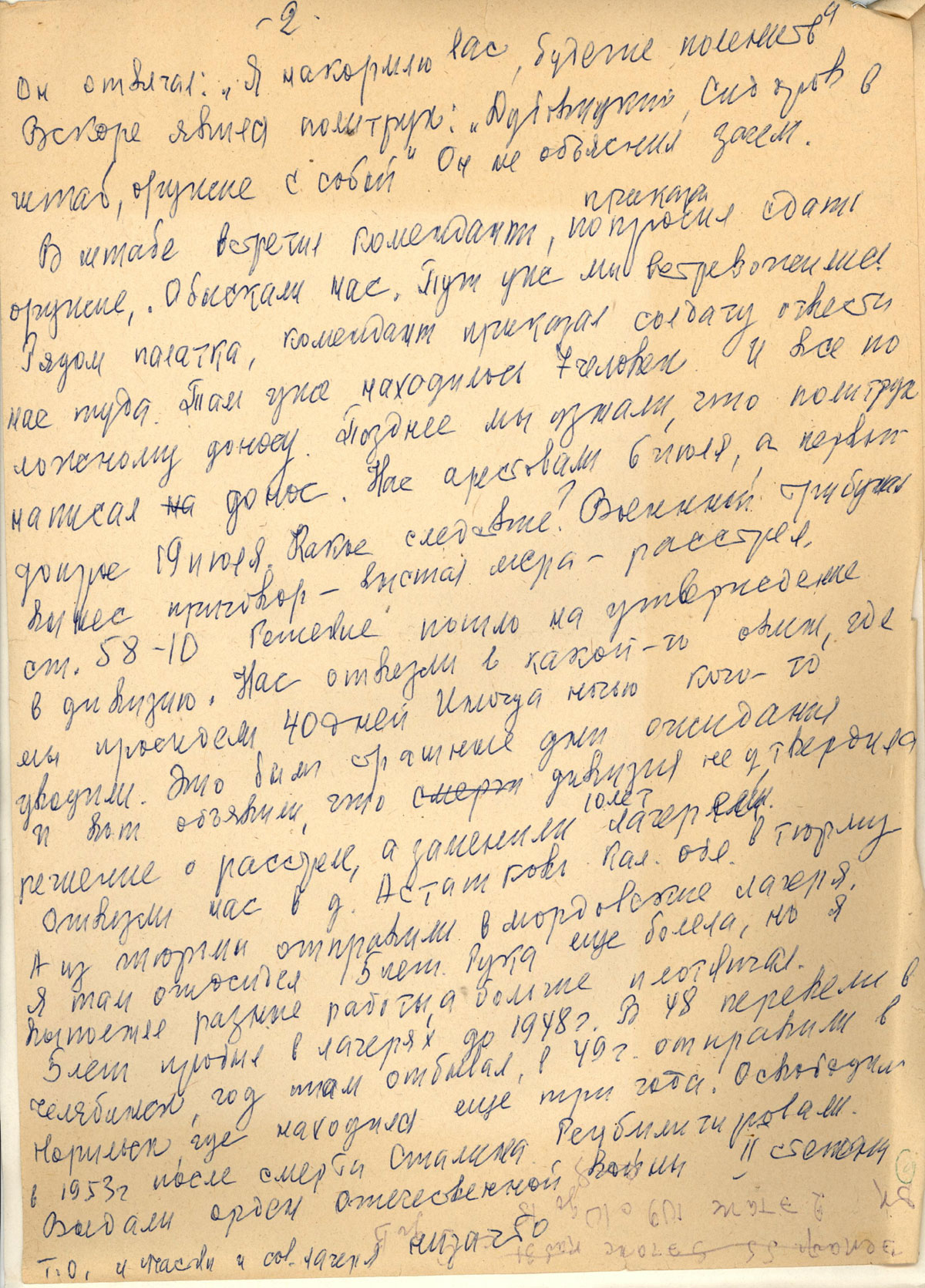 В штабе встретил комендант, приказал/попросил сдать оружие. Обыскали нас. Тут же мы встревожились. Рядом палатка, комендант приказал солдату отвезти нас туда. Там уже находилось 7 человек. И все по ложному доносу. Позднее мы узнали, что политрук написал донос. Нас арестовали 6 июля, а первый дознание 19 июля. Какое следствие? Военный трибунал вынес приговор - высшая мера - расстрел, ст. 58-10. Решение пошло на утверждение в дивизию. Нас отвезли в какой-то овин, где мы просидели 40 дней. Иногда ночью кого-то увозили. Это были страшные дни ожидания и вот объявили, что дивизия не утвердила решения о расстреле, а заменили на 10 лет лагерей.