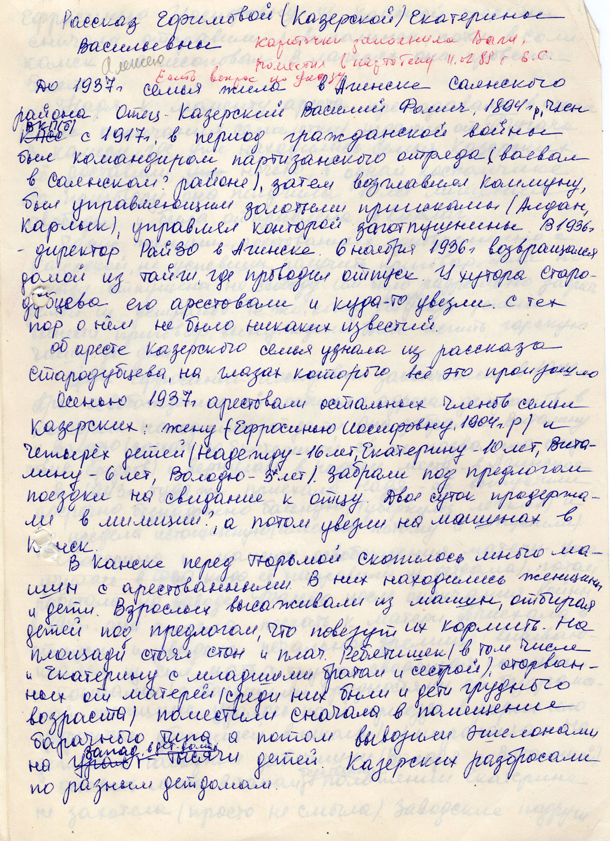 Осенью 1937г. арестовали остальных членов семьи Казерских: жену (Ефросинью Иосифовну 1904г.р.) и четырех детей (Надежду — 16 лет, Екатерину — 10 лет, Виталину — 6 лет, Володю — 3-х лет). Забрали под предлогом поездки на свидание к отцу. Двое суток продержали в милиции?, а потом увезли на машинах в Канск.