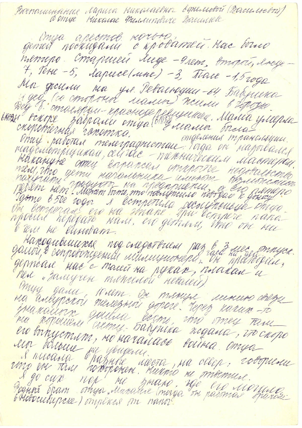 Воспоминания Ларисы Николаевны Ефимовой (Васильевой) об отце Николае Филипповиче Васильеве.