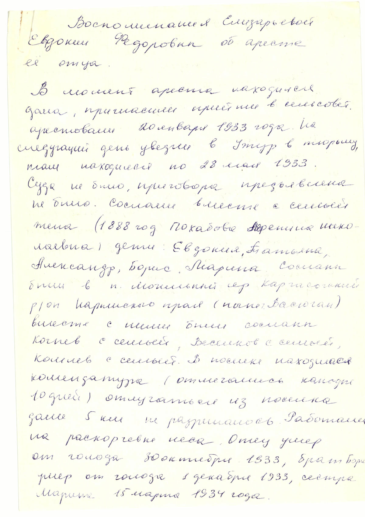 Воспоминания Елизарьевой Евдокии Федоровны об аресте ее отца