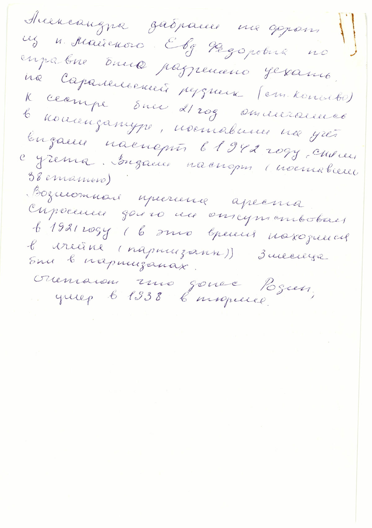 Александра забрали на фронт из п. Можайского. Евдокии Федоровне по справке было разрешено уехать на Саралинский рудник (ст. Копьево) к сестре, был 21 год, отмечались в комендатуре, поставили на учет, выдали паспорт в 1942 году, сняли с учета. Выдали паспорт (поставили 38 статью).