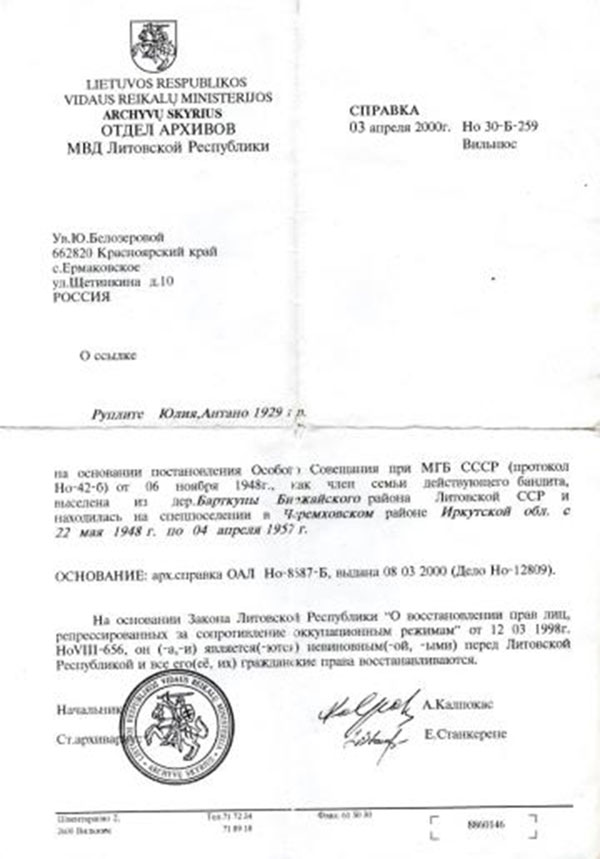 Многие из жителей Литвы попали в наш Красноярский край. В их числе оказалась и 18-летняя Юлия Антоновна Белозёрова (девичья фамилия Руплитэ), родившаяся 4 сентября 1929.