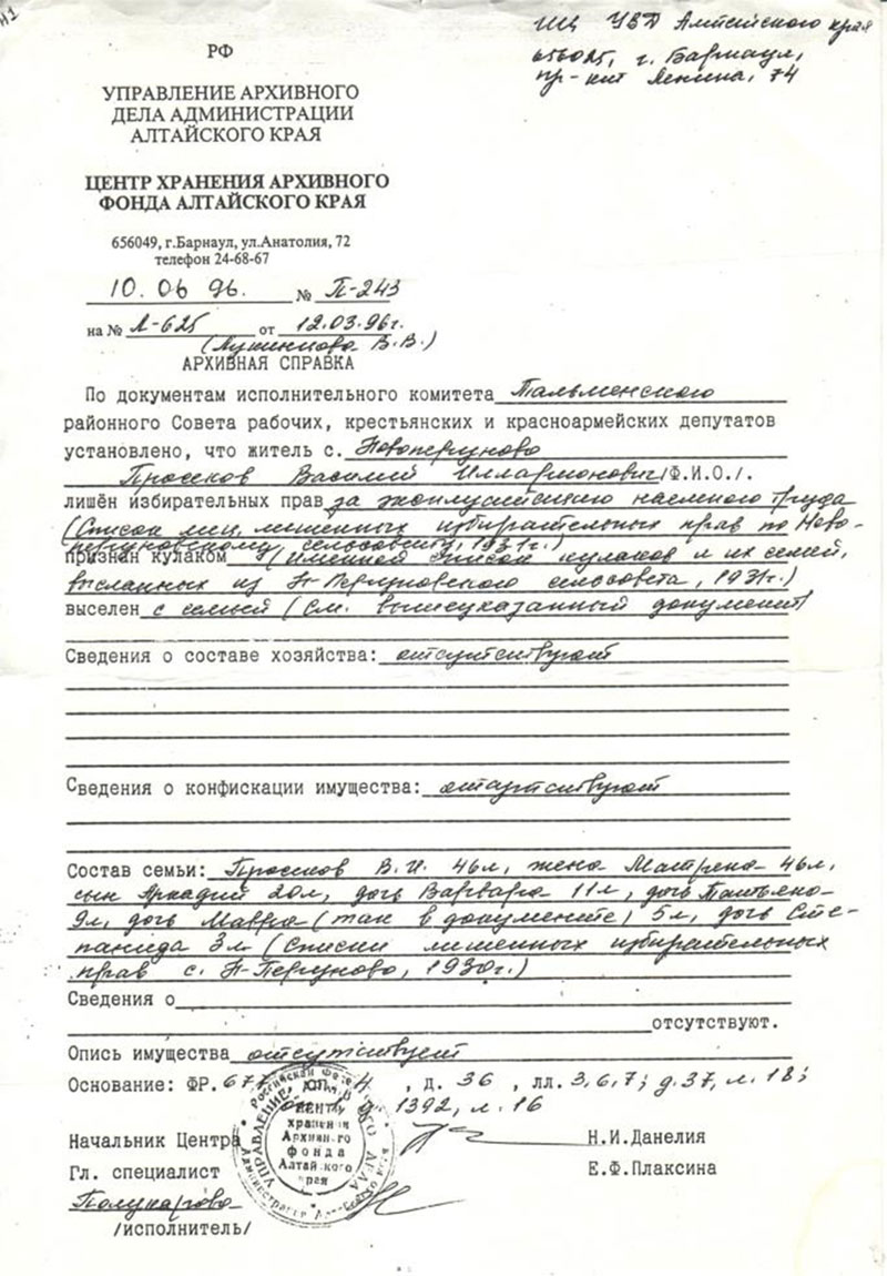 - А ведь забирали практически ни за что, - говорит женщина, - в 1996 году мне и сёстрам прислали архивную справку и справку о реабилитации. Там указано – сведения о составе хозяйства отсутствуют, о конфискации имущества – отсутствуют, состав семьи: родители и пятеро детей. Получается – за детей и репрессировали (?!). Больше ничего не было. Даже дом наш тогда разобрали и увезли в районный центр. Горько сегодня осознавать, что родители пострадали ни за что, а вернее, за своё трудолюбие, терпение, смирение перед судьбой.