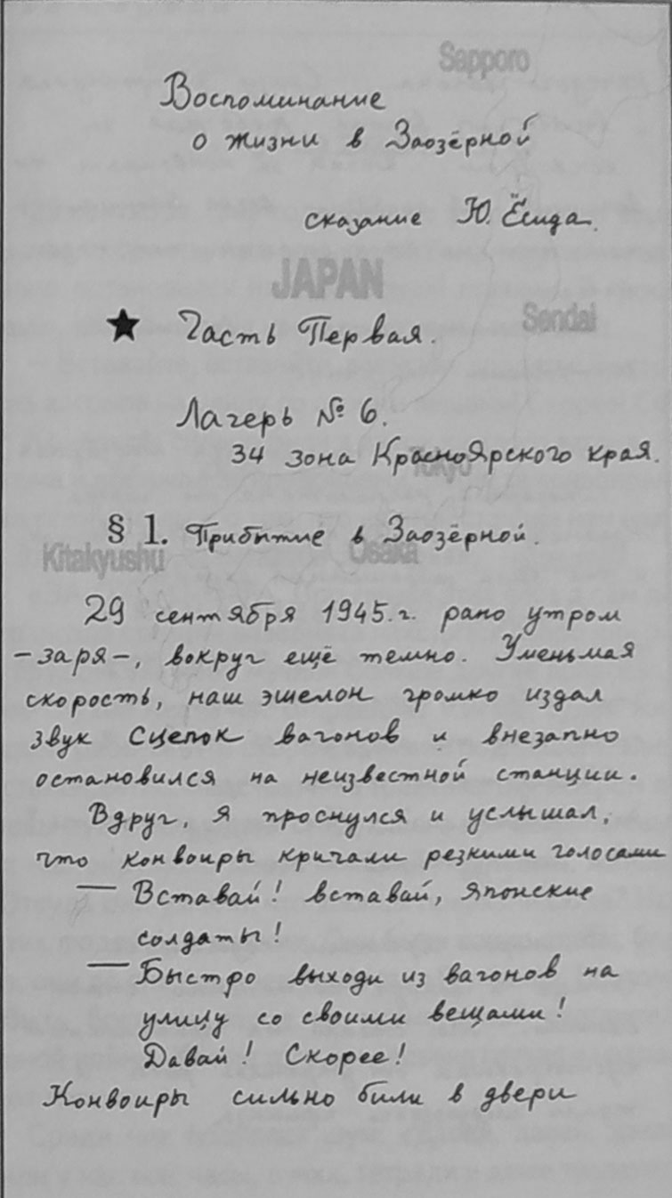 Перед Вами уникальная книга бывшего японского военнопленного Есиды Юкио, проведшего три трудных послевоенных года в лагере для военнопленных в поселке Урал города Заозерного. Когда я прочел эти воспоминания, родилась мысль издать книгу. Я позвонил в Японию автору и попросил разрешение на ее издание. Е. Юкио охотно разговаривал со мной и разрешил опубликовать свои воспоминания. Ёсиде Юкио 78 лет, в настоящее время он ослеп, но память у него хорошая, и он мне дал положительные ответы на все мои вопросы.