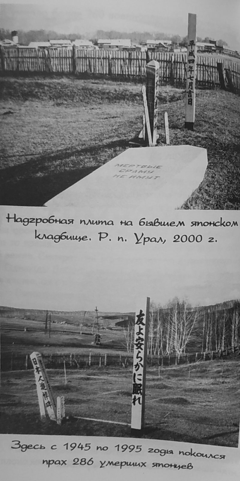 Лето 2000 года. Восточная окраина рабочего поселка Урал. Вместе с заместителем главы г. Заозерного А.А. Юкляевским мы стоим на том самом месте, где 55 лет назад размещался лагерь №6 японских военнопленных. Сегодня уже практически ничто не напоминает о нем. На месте бывших казарм и бараков улица современных домов-коттеджей, жители которых лишь по рассказам старожилов знают о японских невольниках. Правда, нам рассказывали, что один из шлакоблочных домов некогда был бараком для военнопленных, но это вряд ли, ведь в своих воспоминаниях сержант Ёсидо Юкио рассказывал о деревянных строениях.
