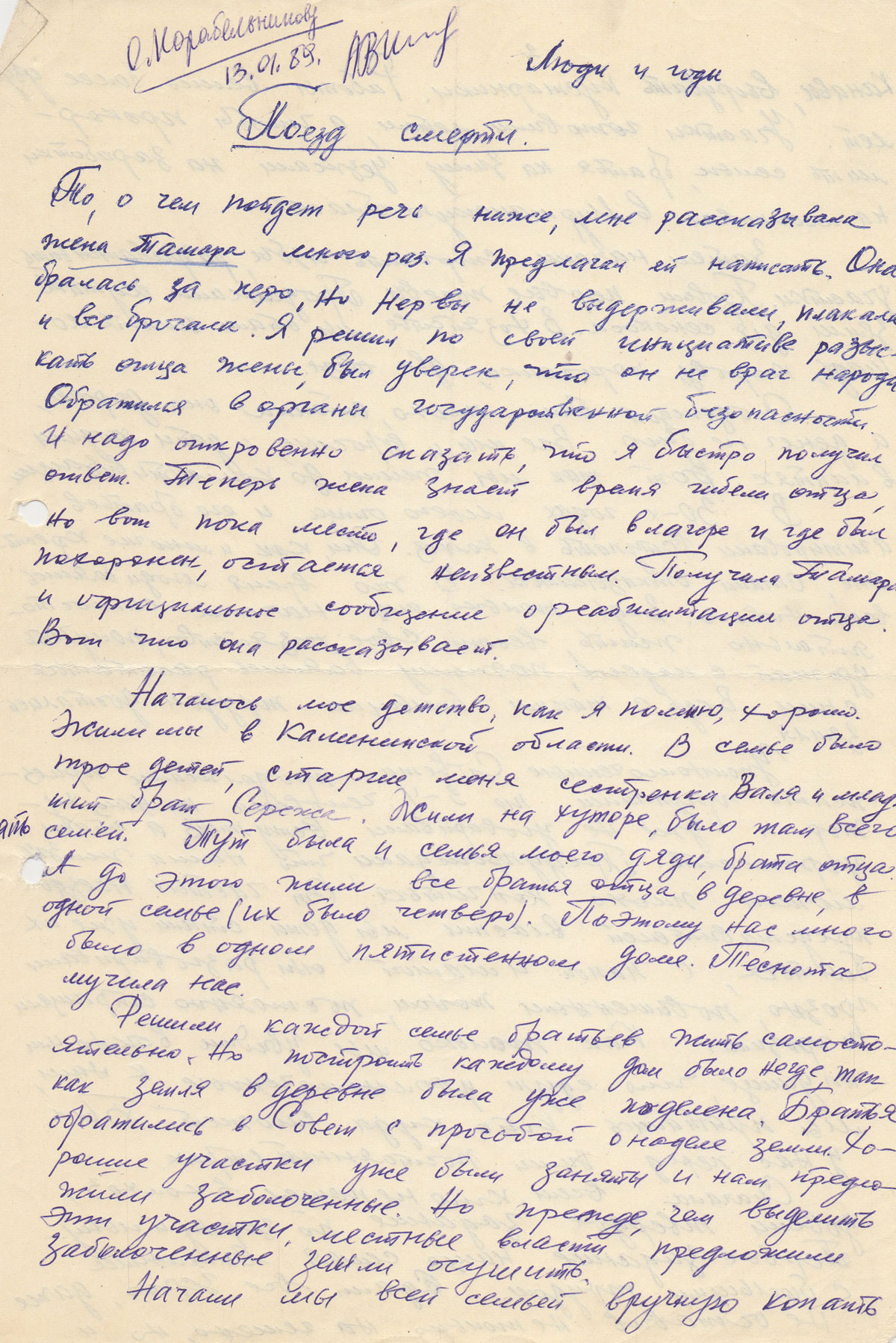То, о чем пойдет речь ниже, мне рассказывала жена Тамара много раз. Я предлагал ей написать. Она бралась за перо, но нервы не выдерживали, плакала и все бросала. Я решил по своей инициативе разыскать отца жены, был уверен, что он не враг народа.