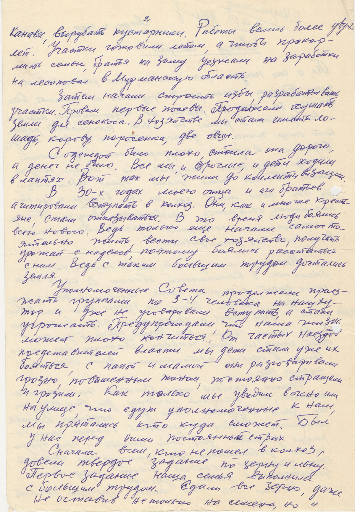 В 30-х годах моего отца и его братьев агитировали вступать в колхоз. Они, как и многие крестьяне, стали отказываться. В то время люди боялись всего нового. Ведь только ещё начали самостоятельно жить, вести своё хозяйство, получать урожай с наделов, поэтому боялись расстаться с ним. Ведь с таким большим трудом досталась земля.