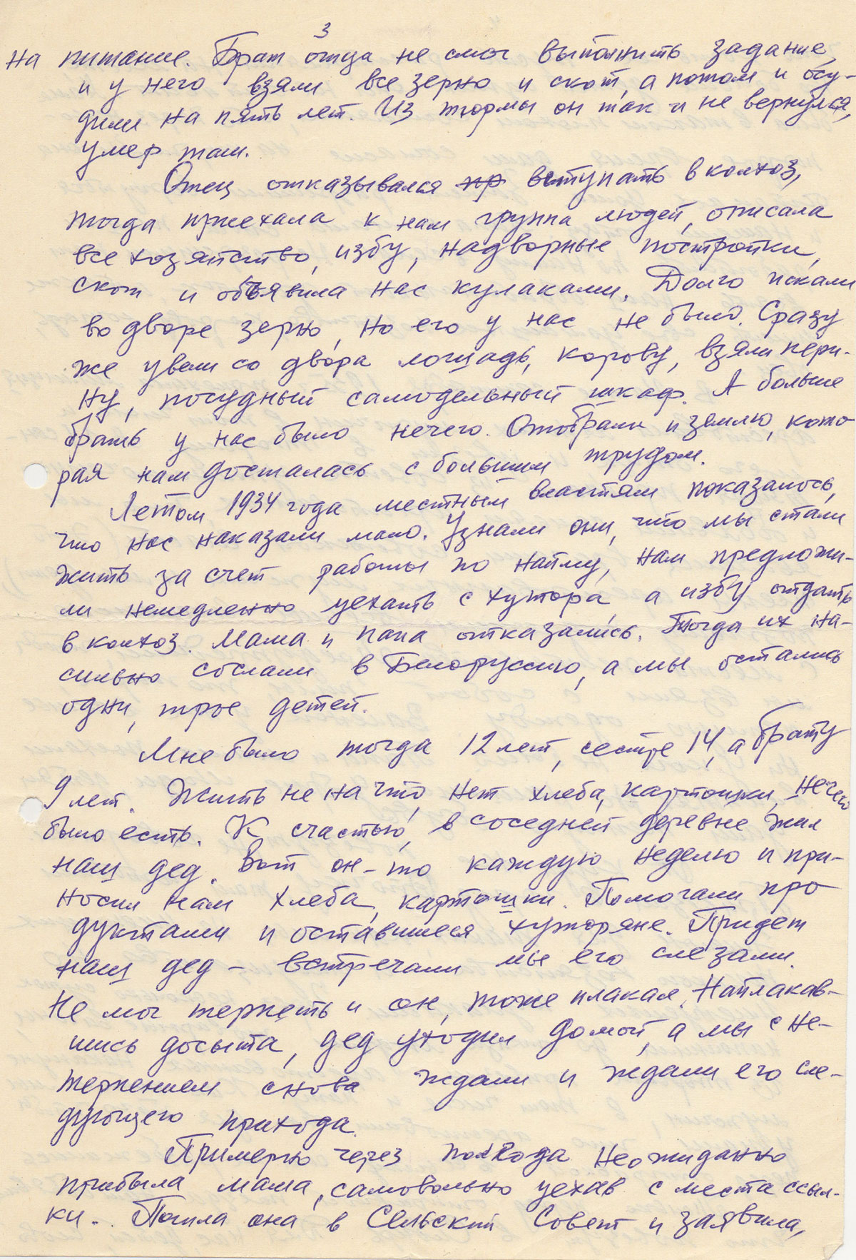 Летом 1934 года местным властям показалось, что нас наказали мало. Узнали они, что мы стали жить за счет работы по найму, нам предложили немедленно уехать с хутора, а избу отдать в колхоз. Мама и папа отказались. Тогда их насильно сослали в Белоруссию, а мы остались одни, трое детей.