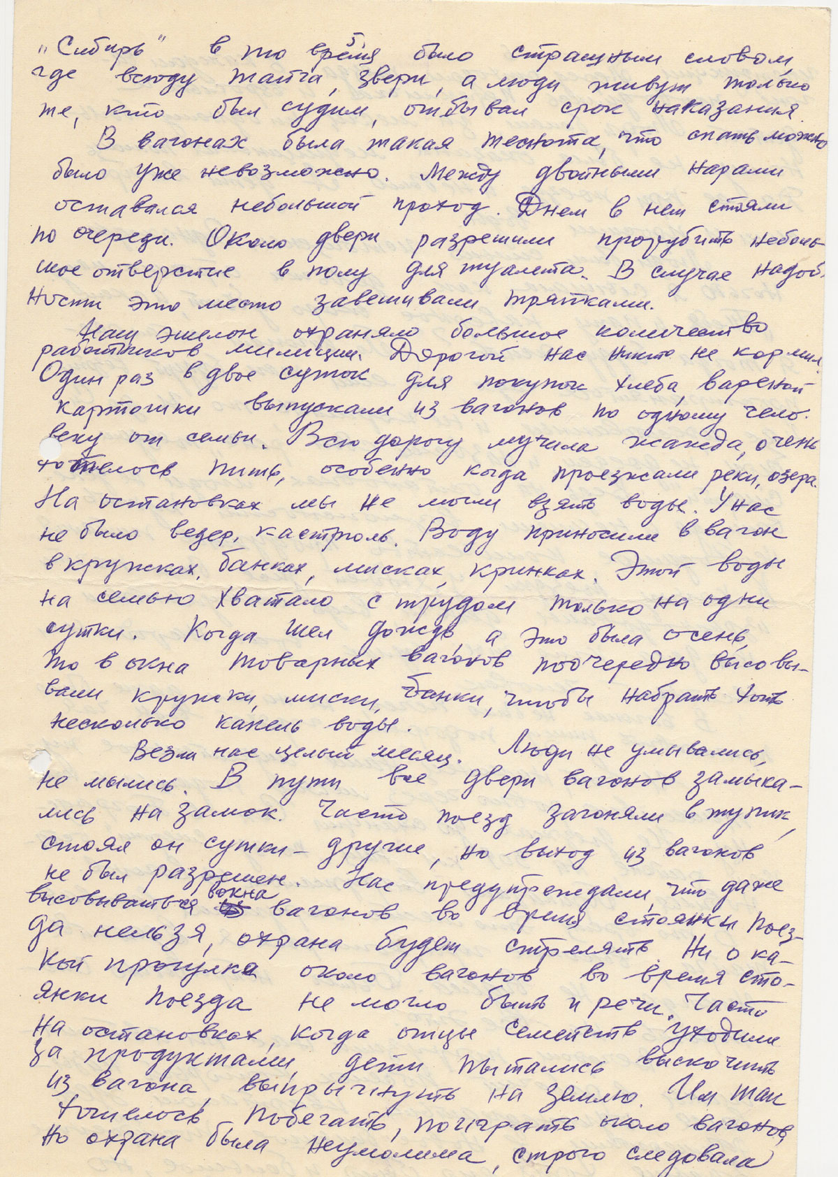Наш эшелон охраняло большое количество работников милиции. Дорогой нас никто не кормил. Один раз в двое суток для покупок хлеба, варёной картошки выпускали из вагонов по одному человеку от семьи. Всю дорогу мучила жажда, очень хотелось пить, особенно когда проезжали реки, озера. На остановках мы не могли взять воды. У нас не было ведер, кастрюль. Воду приносили в вагон в кружках, банках, мисках, кринках. Этой воды на семью хватало с трудом только на одни сутки. Когда шёл дождь, а это была осень, то в окна товарных вагонов поочередно высовывали кружки, миски, банки, чтобы набрать хоть несколько капель воды.