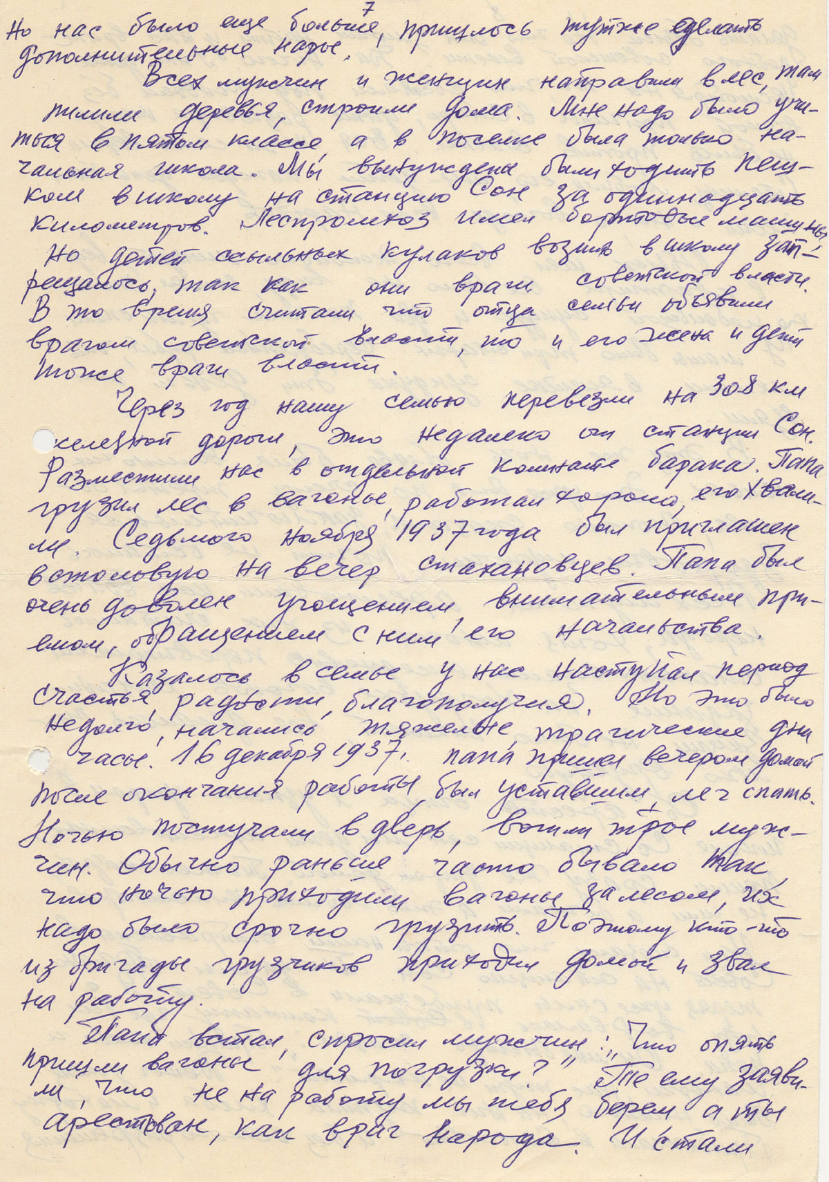 Через год нашу семью перевезли на 308км железной дороги, это недалеко от станции Сон. Разместили нас в отдельной комнате барака. Папа грузил лес в вагоны, работал хорошо, его хвалили. Седьмого ноября 1937 года был приглашен в столовую на вечер стахановцев. Папа был очень доволен угощением, внимательным приемом, обращением с ним его начальства.