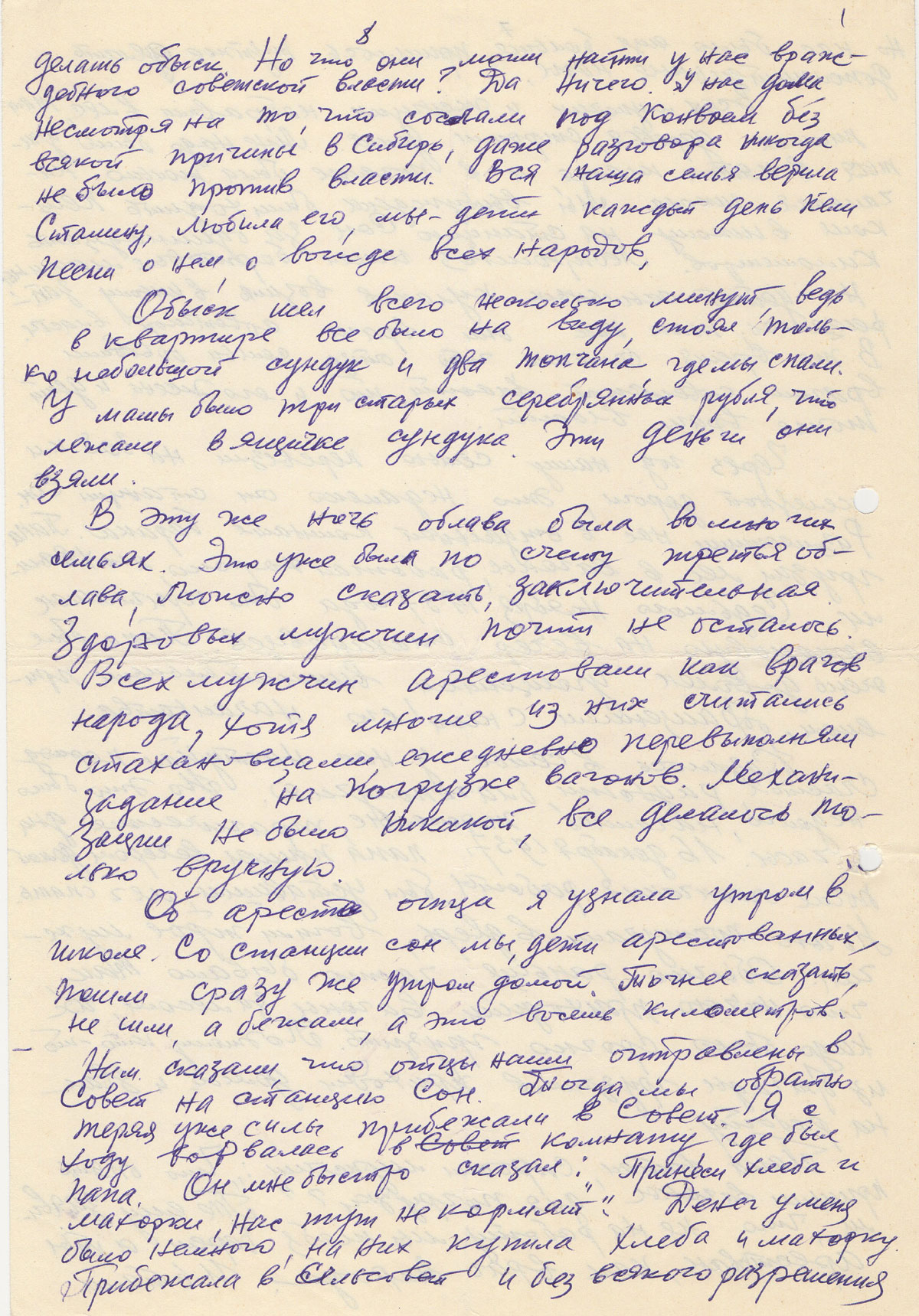 Об аресте отца я узнала утром в школе. Со станции Сон мы, дети арестованных, пошли сразу же утром домой. Точнее сказать не шли, а бежали, а это восемь километров. Нам сказали, что отцы наши отправлены в Совет на станцию Сон. Тогда мы обратно теряя уже силы прибежали в Совет. Я с ходу ворвалась в комнату, где был папа. Он мне быстро сказал:»Принеси хлеба и махорки. Нас тут не кормят». Денег у меня было немного, на них купила хлеба и махорку. Прибежала в сельсовет и без всякого разрешения у охраны бросилась к отцу, передала хлеб и махорку. В это время ко мне подскочил охранник, схватил за ворот пальто и бросил меня к дверям, а затем вытолкнул из комнаты.