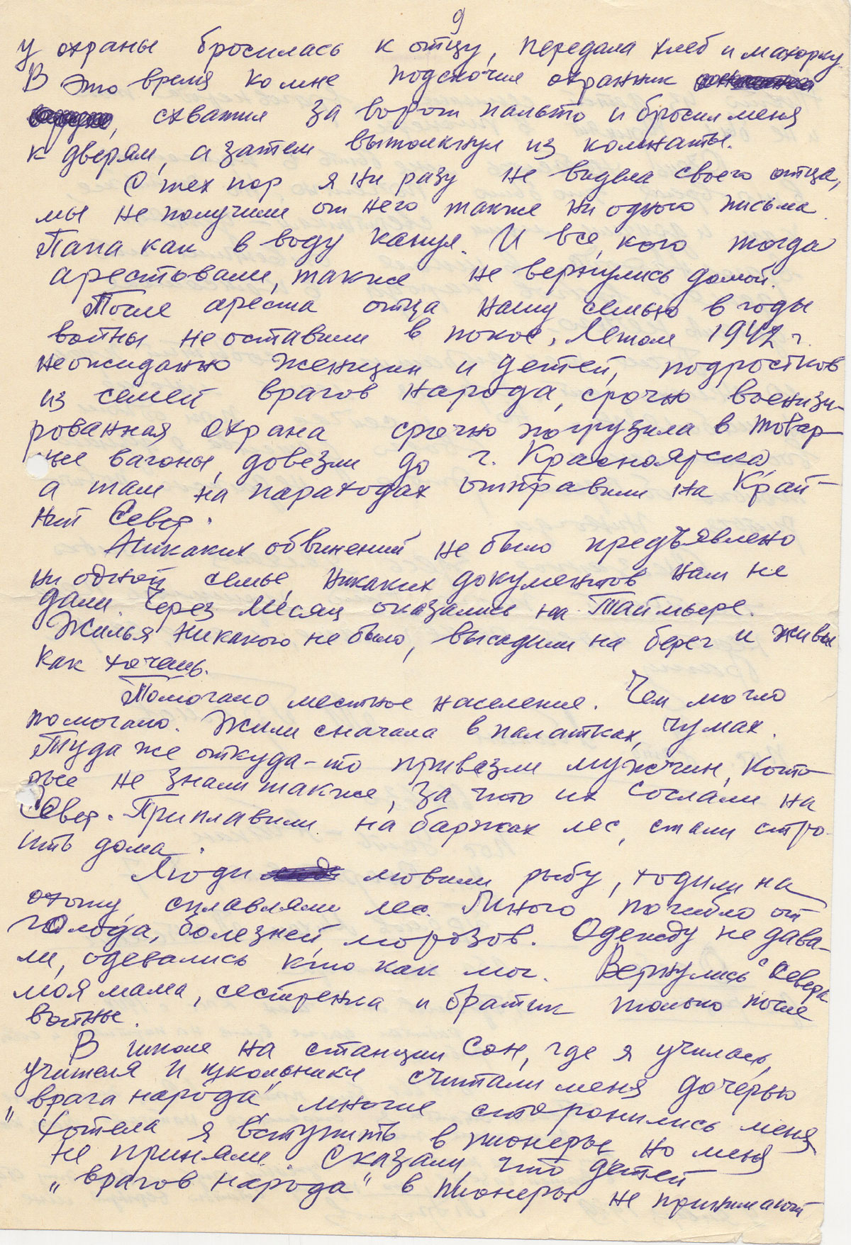 С тех пор я ни разу не видела своего отца, мы не получили от него также ни одного письма. Папа как в воду канул. И все, кого тогда арестовали, также не вернулись домой. После ареста отца нашу семью в годы войны не оставили в покое. Летом 1942г. неожиданно женщин и детей, подростков из семей врагов народа, срочно военизированная охрана срочно погрузила в товарные вагоны, довезли до г. Красноярска, а там на пароходах отправили на Крайний Север.