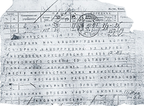 Норильск, срочно посланного телеграфом на адрес Кашпир-рудника Сызранской