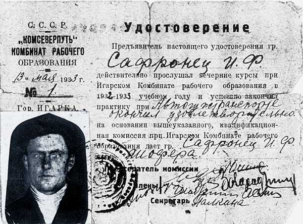 шофера, выданное Иосифу Феофановичу Сафронцу комбинатом рабочего образования «Комсеверпуть».