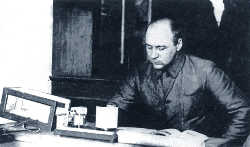 Геофизик Д.Г. Успенский за регулировкой сейсмографа, сделанного им из барографа.