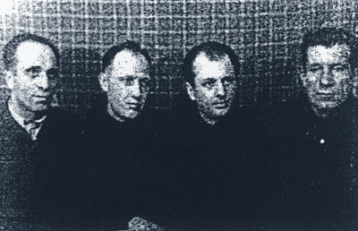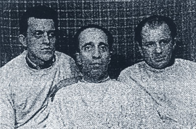 А потом хирург из санчасти, заключенный Георгий Яковлевич Денисов, великолепный доктор из Саратова, пригласил меня работать в санчасть фельдшером. Людей с большим, чем я, медицинским образованием в лагере не нашлось. Это меня и спасло. Я больше года работал в санчасти, многому научился. В больнице работали хирург, терапевт и три фельдшера — бывший студент Вильнюсского медицинского института, бывший заведующий одним из областных отделов народного образования и я. Вот снимок тех лет. Он был подпольно сделан приехавшим в лагерь рентгеновским техником. В центре — хирург Г.Я.Денисов, слева — мой коллега-фельдшер из Литвы, справа — ваш покорный слуга. Как видите, волосы нам уже разрешили отращивать, наголо не стригли.
