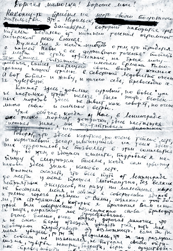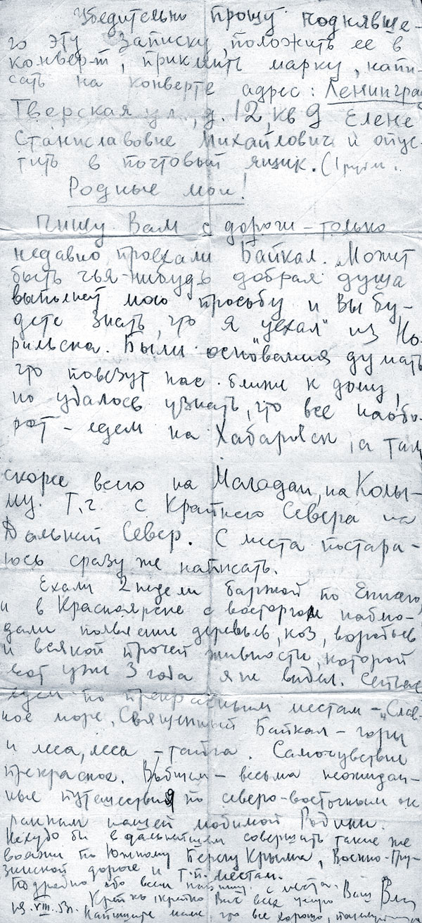 ...Дорога. По ней идет длинный, очень длинный состав из красных теплушек, с пулеметами на крышах, с автоматчиками... На станциях к нам подбегали люди, пытались совать нам хлеб, сахар, еще что-то, но охрана не пропускала. Мы проехали Иркутск и увидели Байкал. Тогда еще не было верхней дороги, и поезд шел прямо по берегу Байкала. Проехали Байкал, остановились на станции Слюдянка. Около поезда собралось много людей, но охрана их отгоняла. Я нашел клочок бумаги, огрызок карандаша и написал: «Тот, кто поднимет это письмо, просьба наклеить марку и отправить по написанному здесь адресу: Ленинград, Тверская ул., д.12, кв.18, Елене Станиславовне Михайлович». Далее я написал: «Родные мои! Нас везут куда-то на восток, скорее всего на Колыму. Приеду на место — напишу». И вот чья-то добрая душа подобрала эту записку, отправила ее. С тех пор прошло более 50 лет. Этот клочок бумаги лежит сейчас передо мной с невыцветшими буквами, вместе с остальными письмами, отправленными мною по тому же адресу. Вот он.