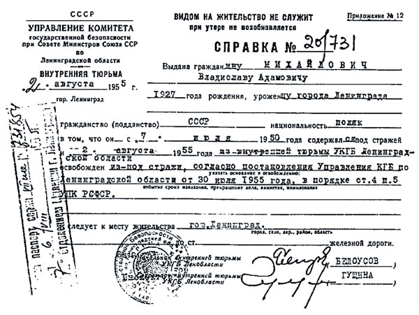 Я вышел на Литейный проспект в лагерной одежде, кирзовых сапогах, с деревянным чемоданчиком, подаренным мне в лагере друзьями, с 60 рублями в кармане, которые были у меня на лицевом счете, и справкой об освобождении. Вот она/