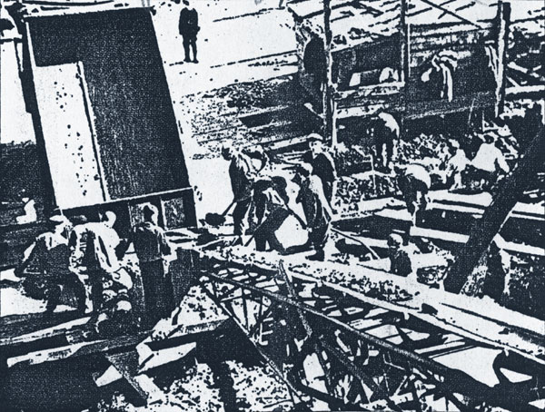 Кирпичи на стену заносили на пятый или седьмой этаж вручную. Человеку на плечи прикрепляли специальную доску («козлик») с упором, на нее накладывали 15-20 кирпичей, и человек должен был занести их по трапу наверх. И так целый день цепочкой, один за другим, пока кто-нибудь не упадет от немощи. Бывало, что таких ослабевших рабов бригадиры избивали и даже уменьшали норму питания. Но после прибытия новых этапов таких бригадиров обуздали — издевательства прекратились.