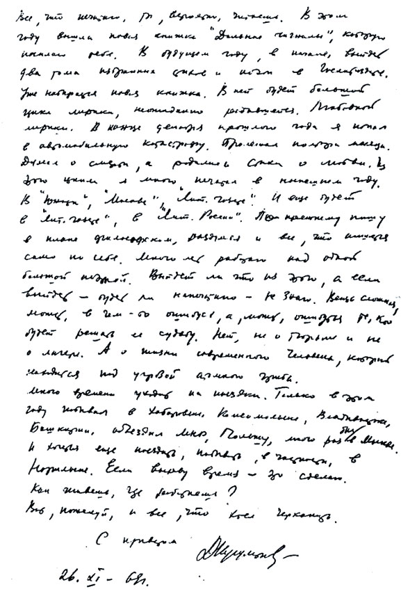 Много времени уходит на поездки. Только в этом году побывал в Хабаровске, Комсомольске, Владивостоке, в Башкирии, объездил МНР, Польшу, много раз был в Москве. И хочется еще поездить, побывать, в частности, в Норильске. Если вырву время — это сделаю. Как живешь, где работаешь? Вот, пожалуй, и все, что хотел черкнуть. С приветом. Д.Кугультинов».