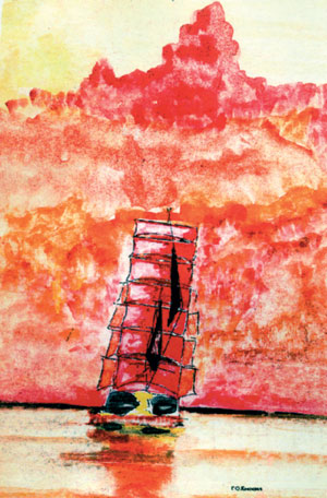 И он рассказал, как в жуткий шторм погибал пароход, как молодой капитан, гигантского роста, неимоверной силы и храбрости, его спасал. Поведал о восстании каторжников, о красавице, жившей на острове, о дуэли этого капитана с одним охотником из-за нее. Романтичен был конец рассказа: спасенный пароход под белоснежными парусами уходит из места трехлетнего своего плена и скрывается за островами.