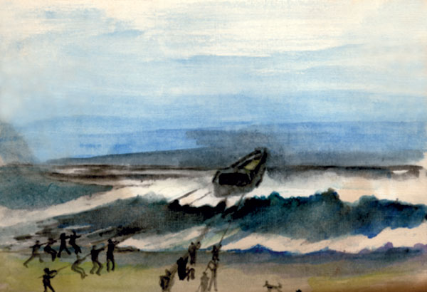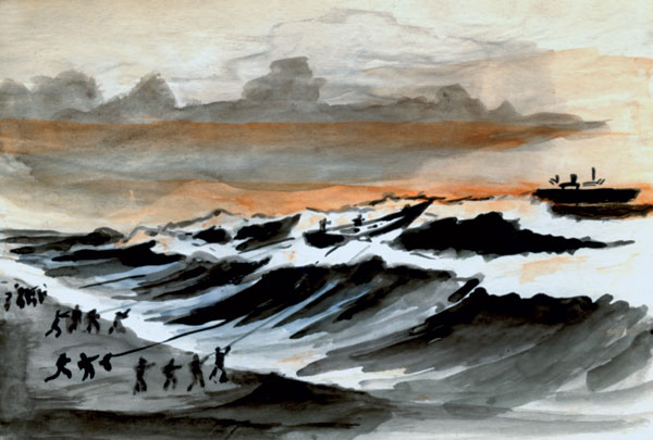 ...В восемнадцать выгрузку закончили. Волна увеличилась, и «Амыл» начало бить о берег. Наконец эта богадельня отошла. Приготовил ракетницу для салюта, как вдруг крик: «Дайте шлюпку — якоря запутались!» Когда мы их распутали, было десять вечера. «Шторм» наконец ушел. Я выдал по шестьдесят граммов спирта. Спать легли под скалой, на самом берегу у костра.