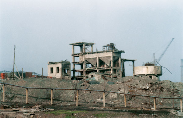 Если ехать маршрутными автобусами от остановки «Цементный за вод» в сторону города, то слева, наверху откоса, хо рошо виден четырехэтажный бетонный остов с двумя бункерами. Это и есть то, что осталось от Опытной обогатительной фабрики, расширившейся и получившей название Малой обогатительной. В том числе благодаря и этому строению в Норильске в годы войны был получен никель.