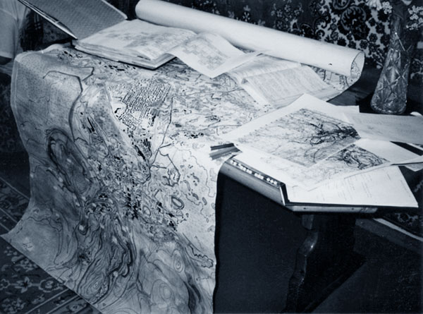 Я снова перешел на новое место работы. Здесь уже нет сумасшедшего напряжения, уже свободны суббота и воскресенье и время обеда — мое. Наводя порядок в кабинете, я нашел несколько рулонов бумаги и пересмотрел их: это были плакаты, схемы гражданской обороны 50–60-х годов. В них же лежали деформированные от воды четыре кальки с безобразной бледной графикой. Когда я всмотрелся в них, радости моей не было предела. Это были кальки города и промышленной зоны! Они были без определения масштаба, точек отсчета. На них не были указаны стороны света. Во всем этом для меня не было необходимости. У меня была карта, которая вдохновила меня на дальнейший труд. Мои чувства трудно было передать.