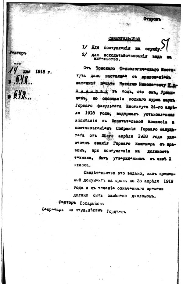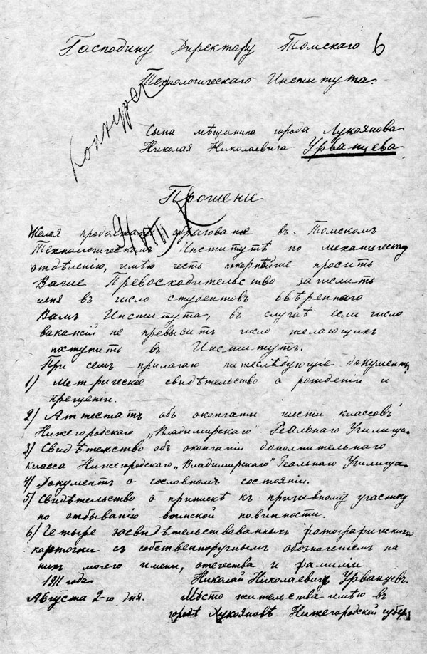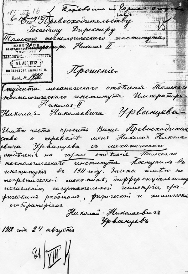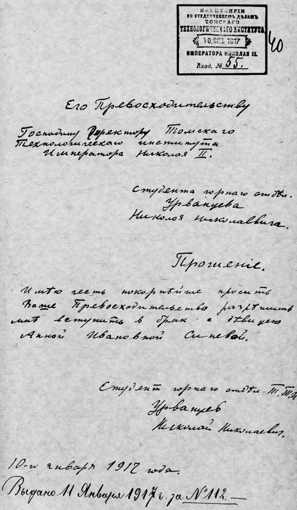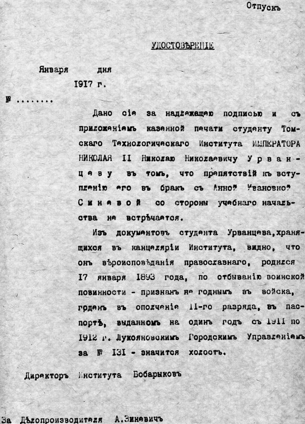 ...Я продолжал посылать запросы в Томск, Лукояново, Красноярск и получал ответы, копии документов. И вот что я узнал. Следы дяди Николая Михайловича Потапаева как-то сразу потерялись, а Николай Урванцев, еще будучи студентом, 12 января 1917 года подал ректору прошение о женитьбе на девице Синёвой. Тогда был такой порядок, учебное заведение проверяло, не был ли студент женат ранее.