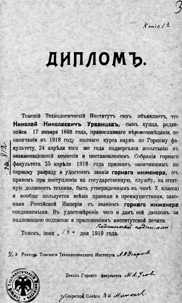 В те годы Сибирь остро нуждалась в специалистах. Томский технологический институт был первым высшим учебным заведением в Сибири. Институту было 11 лет, когда в него поступил Н.Н. Урванцев.