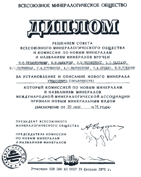 Только после этого новый минерал получает право на жизнь и заносится в международную книгу по минералогии. Новый минерал прошел все проверки, и его открыватели получили диплом Всесоюзного минералогического общества об этом. Минерал этот получил название УРВАНЦЕВИТ, и его открыватели, среди которых есть мои ученики, прислали мне копию своего диплома с письмом об открытии.