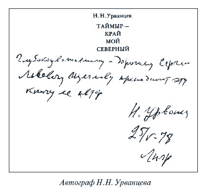 Однажды в солнечный день пришел и я к Николаю Николаевичу. Пришел не как горняк, а как самодеятельный журналист — взять интервью. В результате обстоятельной беседы написал очерк. Так началось наше многолетнее личное общение. Когда он уехал из Норильска в Ленинград и вернулся к работе в Институте Арктики и Антарктики, у нас завязалась переписка. В 1957 году в журнале «Сибирские огни» была напечатана моя статья «Столица енисейского Севера» — под рубрикой «Города родной Сибири» (Норильск тогда уже получил статус города). Естественно, там много было сказано и об Урванцеве.