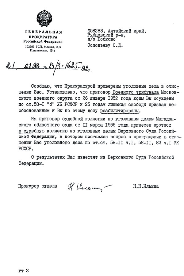 Письмо из Генеральной прокуратуры от 1992 г.