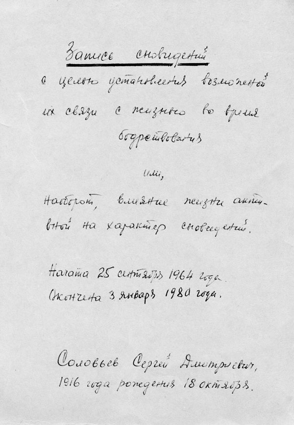 От тетради — застарелый запах сырости, пыли, табачной горечи, крепкого камня тюремных стен. Запах несвободы, непередаваемый запах тоски. Под светлой обложкой 20 тонких тетрадочек по 8 листков. Значит, 320 страниц, исписанных мельчайшим, бисерным почерком, иногда по-французски, большей же частью по-русски. Заметив мой интерес к этим записям, Сергей Дмитриевич щедро решает: «Я дарю вам тетрадку, читайте!» Что же, пусть она поможет моим расспросам и рассказам С.Д. Соловьёва о его жизни…