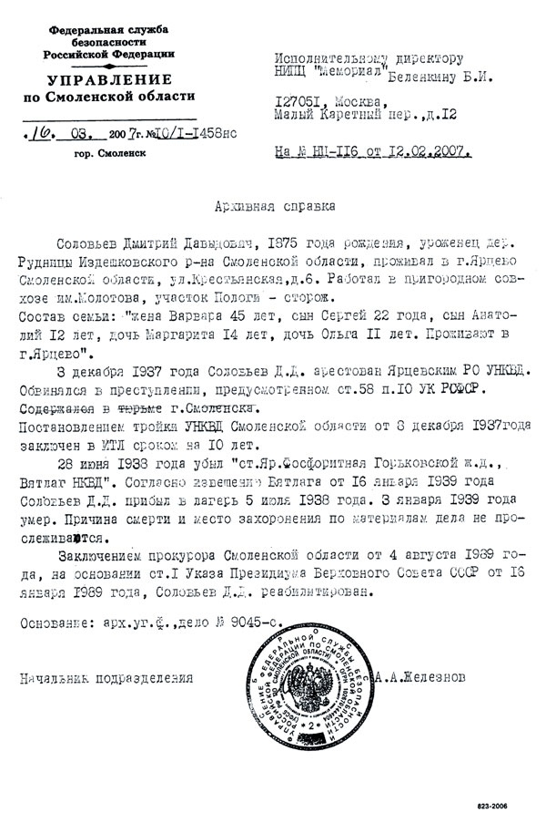Архивная справка об отце С.Д. Соловьёва