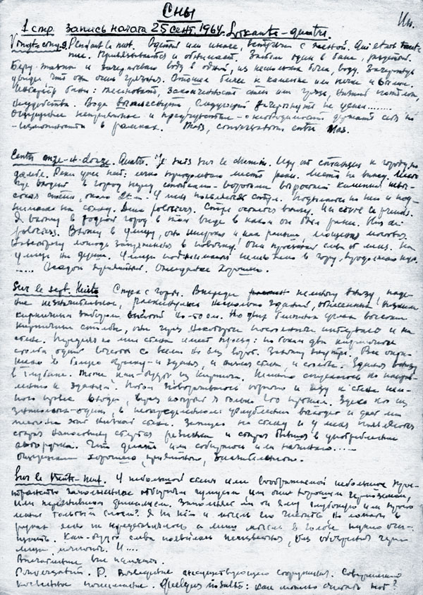 «04.08.73. Я в лагере с одним хорошим товарищем, но кто, не знаю. Готовимся мы с ним к fuite (франц. fuite — бегство, побег). В ходе подготовки нас decouvrent (франц. decouvrir — раскрывать, обнаруживать). Ночь. Заходят со шмоном. Мы прячемся. Прячемся до тех пор, пока стало видно. Потом опять ходят, хотят найти нас. Наконец мы и сами уже не прячемся, и нас не хотят брать. Через некоторое время приходит солдат с ордером, подписанным прокурором, на арест. Для нас это значило: из лагеря — в тюрьму. Наконец нас собирают и набирают полную группу. В последний момент я нашел фуфайку и головной убор. Идем под конвоем… Остановились.