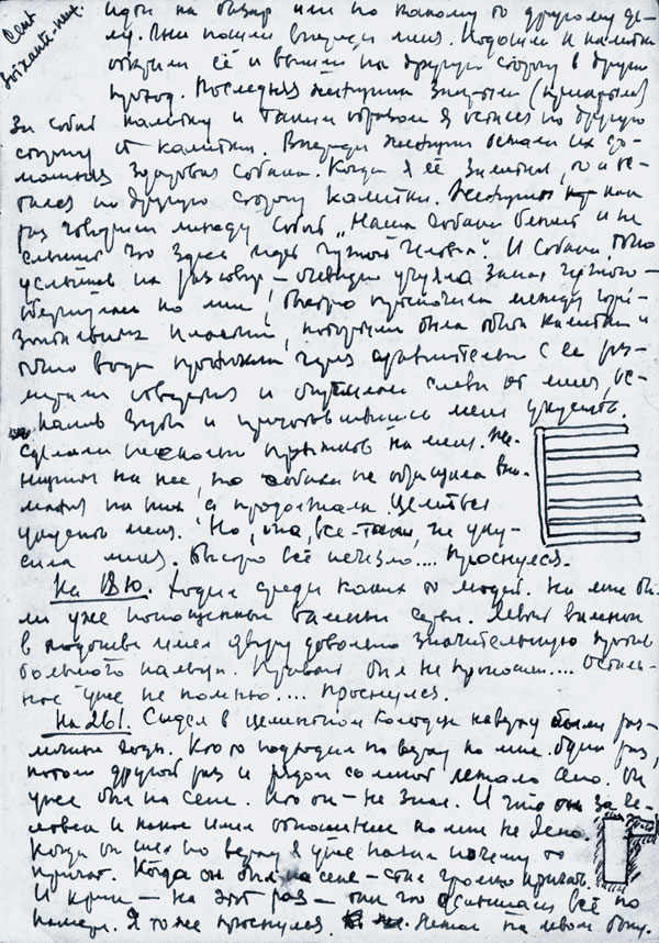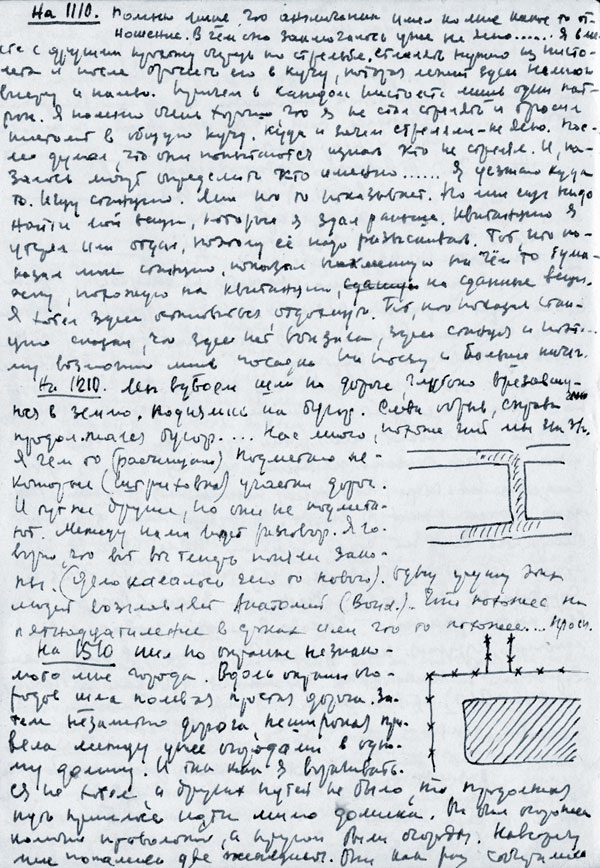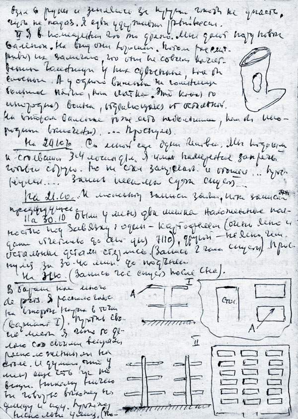 «…Какое-то помещение. Справа от меня начальник спецчасти держит в руках раскрытое (нетолстое) мое первое дело. Слева группа девушек и женщин — все безликие: присутствие ощутимо, но ни одной видимой отчетливо личности. Капитан читает дело, и в одном месте заметно какое-то не то несоответствие, не то неправильность. Восклицаю: «Какая безграмотность!» После этих слов капитан дело закрывает и кладет как будто на стоящий (недалеко от него) стол-конторку. И сразу начинает есть белый (похожий на наш) хлеб. Хлеб отломан бесформенно — большим куском от буханки. Я сразу же начинаю просить снова прочесть мое дело. Вскоре оно появляется раскрытым перед моими глазами. Никитин продолжает есть хлеб, дело необъяснимо держится перед моими глазами. Я его читаю и просыпаюсь…»