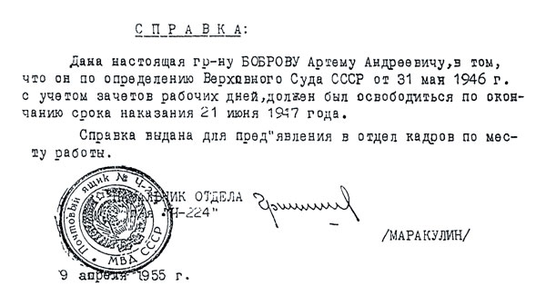 Подробности этой загадочной истории в полном объеме раскрылись спустя много лет, а точнее, в 1954 году, когда я стал интересоваться своим делом. Вот тогда Министерство безопасности по Российской Федерации и управление по Москве и Московской области выдало справку, в которой было сказано буквально следующее: «31 мая 1946 года Военная коллегия Верховного суда СССР пересмотрела уголовное дело по обвинению Боброва А.А. и своим определением снизила ему срок наказания на пять лет».