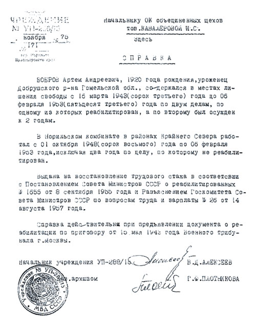 Получалось, что освободить меня должны были еще в Москве в марте 1948 года. А если учесть, что пока я работал на особо важных строительных объектах, шли зачеты (подтверждение тому я нашел уже после освобождения), желанная свобода должна была наступить еще в июне 1947 года. Но этого не случилось. В справке говорится так: «Однако данное определение (снижение срока наказания. — Ред.) исполнено не было. И Бобров А.А. продолжал находиться в местах лишения свободы (имеется в виду его пребывание в Норильске. — Ред.), где был повторно осужден 10 мая 1949 года Спецлагсудом Норильлага НКВД по ст. 110, часть II на два года лишения свободы с присоединением к неотбытому сроку по приговору 14–15 мая 1943 года, всего пять лет». Иными словами, срок моего освобождения отодвигался, и освобожден я был с зачетом рабочих дней лишь в феврале 1953 года, накануне смерти Сталина и восстания в лагерях.