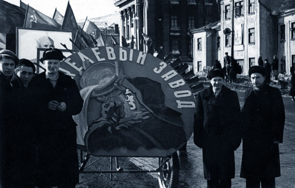 Первомайская демонстрация 1957 года. Справа на заднем плане ДИТР.
