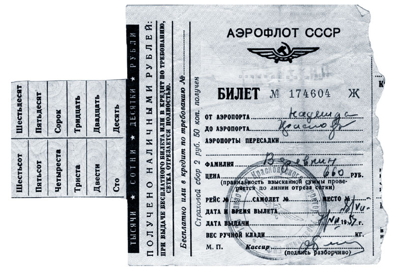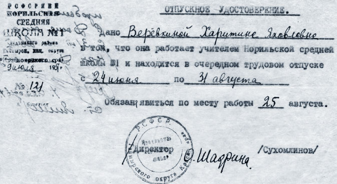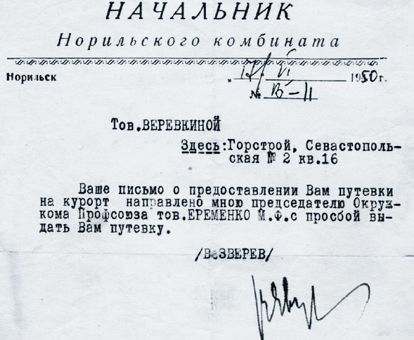 На курорт тогда попасть было довольно сложно, для этого мама обратилась с просьбой к начальнику Норильского комбината В.С. Звереву. Путевку ей выделили, и она ездила лечиться в Кисловодск. Чтобы купить билет на самолет, нужно было иметь отпускное удостоверение или какое-либо официальное письмо с места работы. На обратной стороне отпускного удостоверения позже было написано: «Пробыла в доме отдыха с 3/VII по 26/VII. Нач. Дома отд. Лебедев». А авиабилет она получила, только предъявив просьбу директора школы № 1 О.М. Луговой о выделении маме билета на самолет.