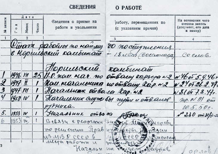 Как следует из последней записи, перед уходом на гражданскую пенсию папа занимал должность заместителя начальника карьера «Медвежий ручей». По трудовой книжке стаж отца на Норильском комбинате исчисляется с 25 июля 1946 года, а из отцовских писем следует, что в Норильск он попал в 1939 году. Стаж стали исчислять только после его освобождения из лагерей.