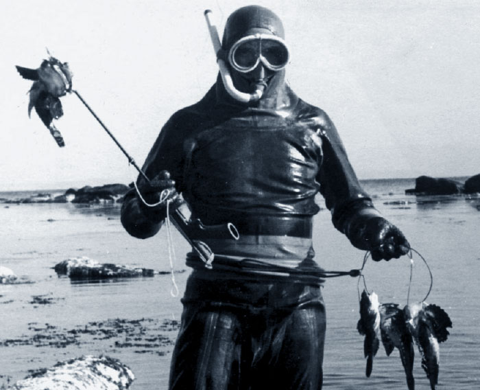 С подводными трофеями в гидрокостюме, так как был ноябрь,
