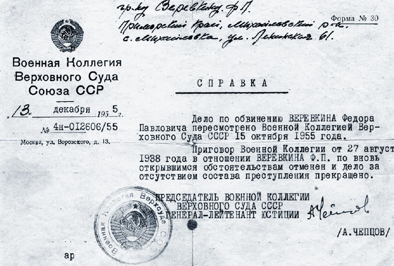 С момента суда и до 1945 года мною написано и послано в высшие органы нашей власти 16 заявлений, но ответ я получил только один в 1941 году, в котором сообщалось, что моя виновность подтверждается свидетельскими показаниями, а посему мое дело пересмотру не подлежит.